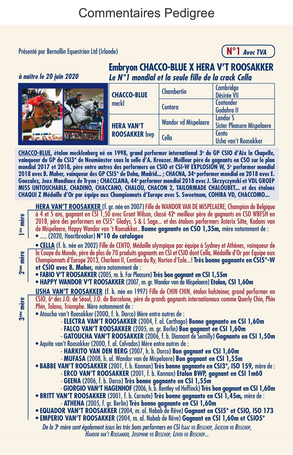 Père : le numéro 1 mondial selon le WBFSH Sire Ranking en saut d’obstacle, CHACCO BLUE (voir lien internet) Voir section ETALONS